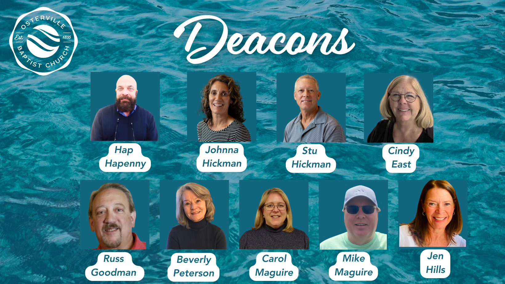 Our Deacons are: Hap Hapenny, Johnna Hickman, Stu Hickman, Cindy East, Russ Goodman, Beverly Peterson, Carol Maguire, Mike Maguire, and Jen Hills