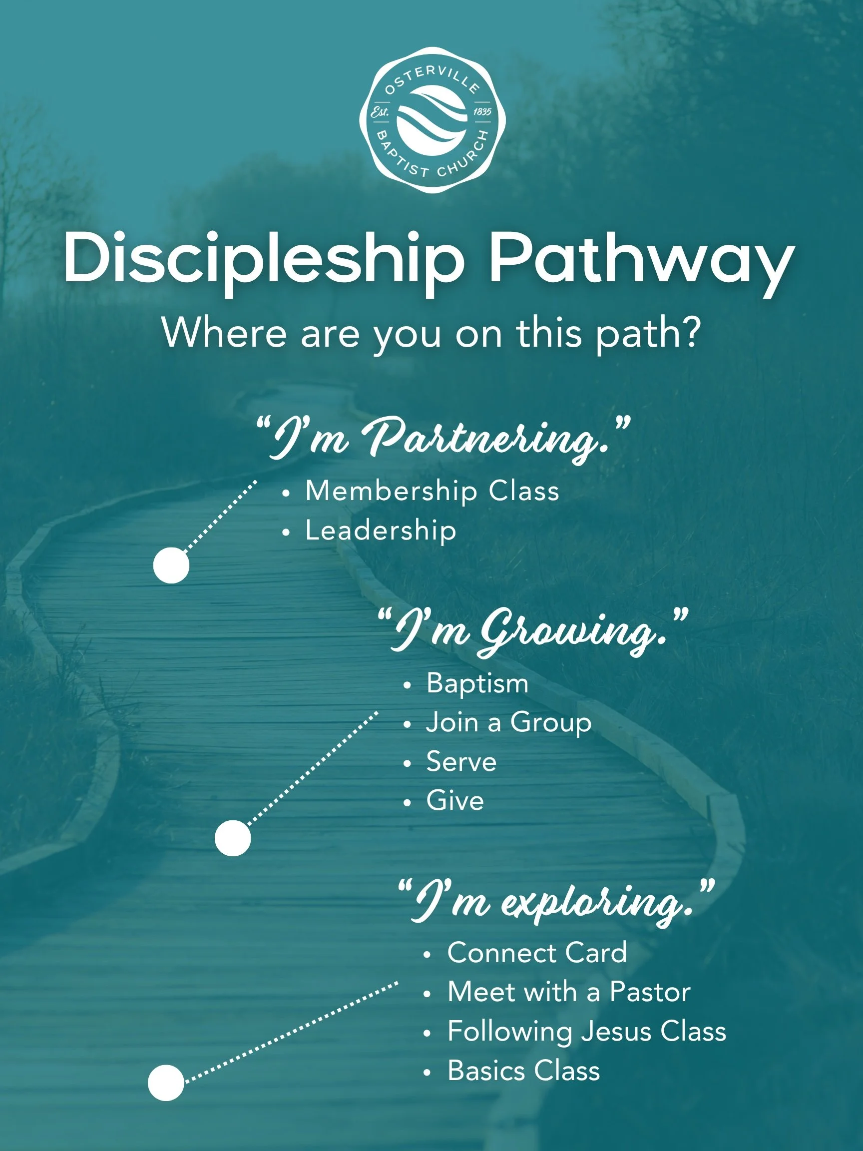NEXT STEPs Sign Ups Fill Out a Connect Card “I’m exploring.” Meet with a Pastor Following Jesus Class Basics Jesus Class Sign up for Baptism “I’m Growing.” Join a Group Volunteer/Serving Opportunities Give Here Sign up for Membership Class “I’m Partnering.” Leadership Opportunities